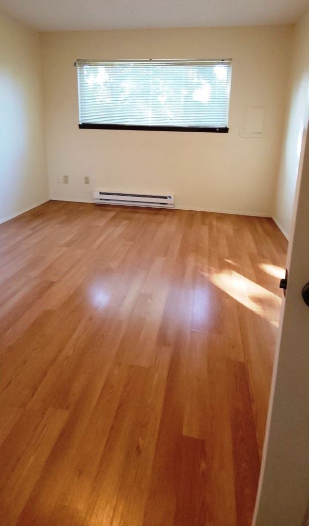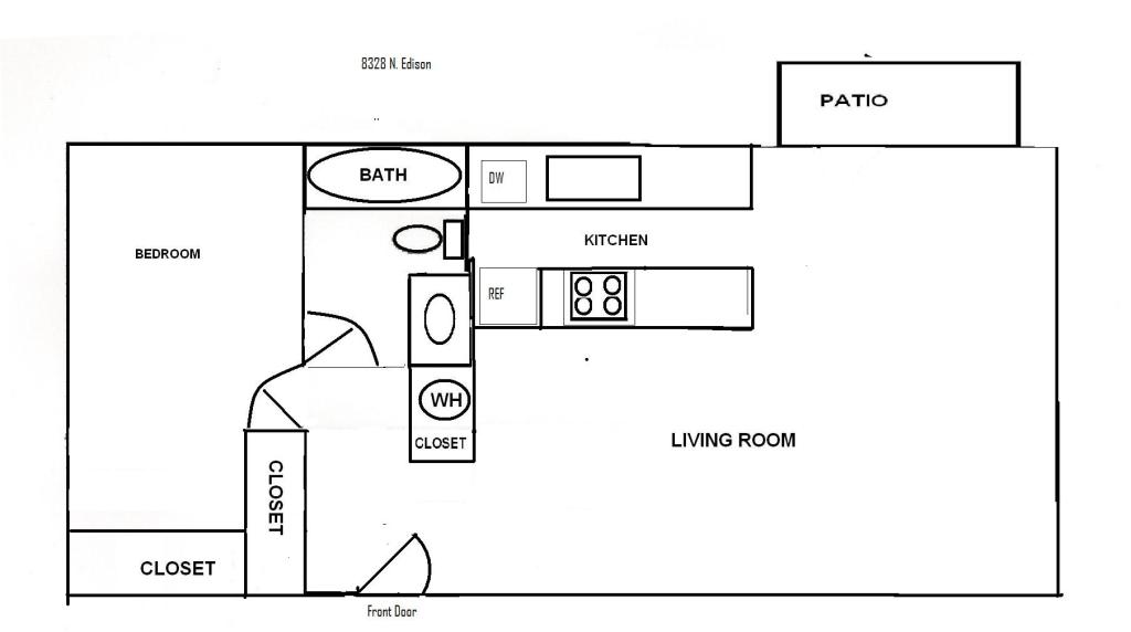 8328 N. Edison is a ground floor apartment with 1 bedroom and 1 bath. It has laminate flooring, a shower with a tub, electric baseboard heat, and an outdoor patio/yard. The kitchen includes a range, refrigerator, and dishwasher, along with plenty of cabinets and large counters.